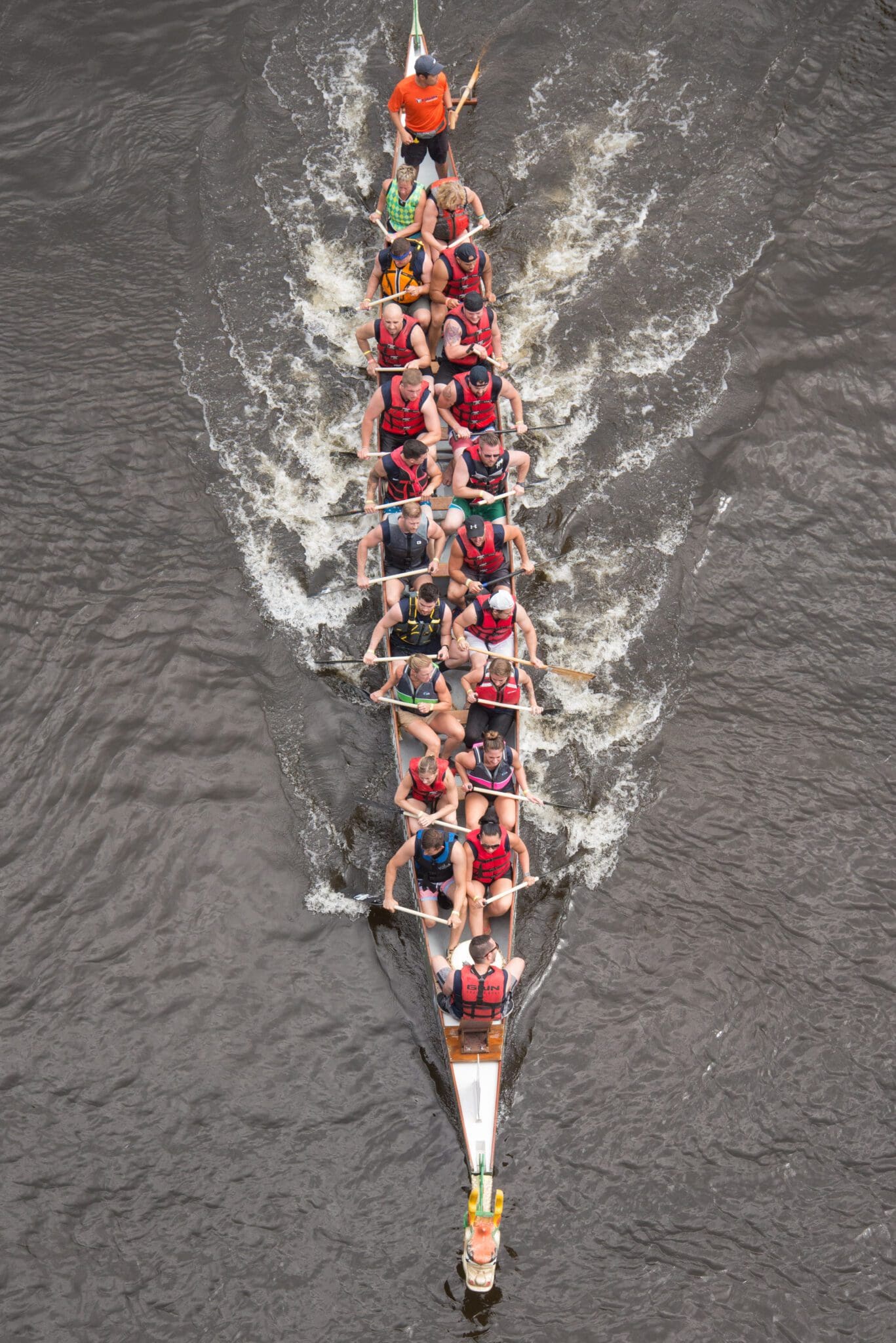 What is dragon boating? It’s a fun team sport you can pick up at any time. Typically, 20 team members paddle the boat, with a drummer seated on the bow drumming a stroke rate for the paddlers. A steersperson stands at the stern and controls the direction of the boat.