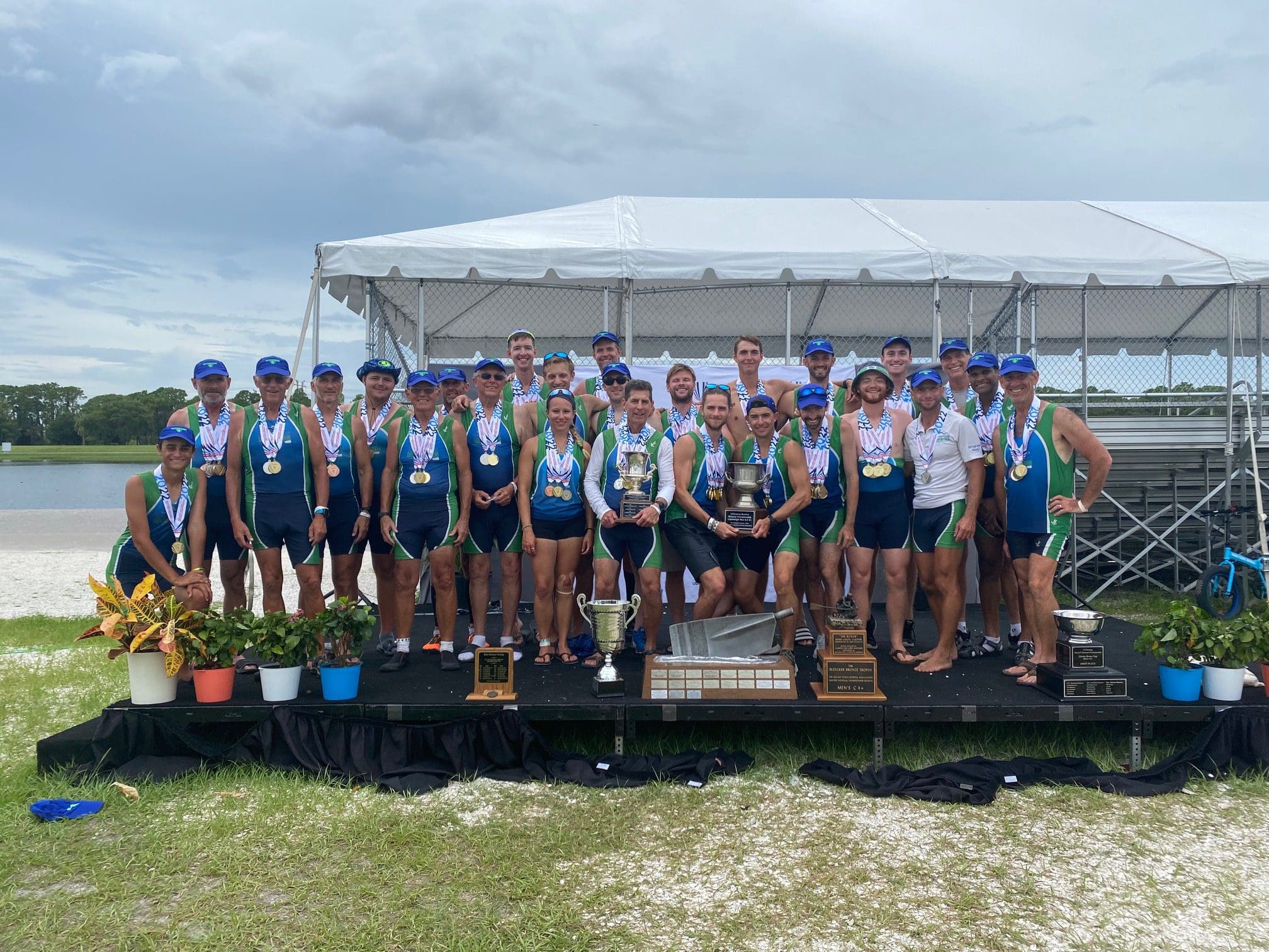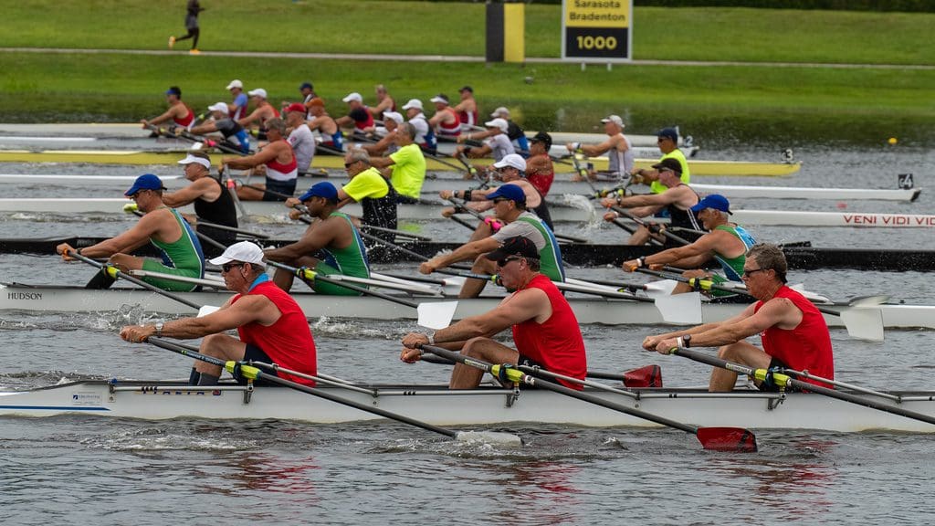 Hartford, CT – August 19, 2022: Riverfront Rowing competed in the USRowing Masters National Championships, held August 11 – 14 at Nathan Benderson Park in Sarasota, Florida. The masters team won the Men’s Points Title for the third time in seven years. And, in a first for the program, the Men’s and Women’s teams won the Overall Points Trophy, bringing a national championship honor home to Hartford. USRowing hosts a national regatta each year for Masters athletes, for participants ranging in age from 21 to 80+, with the race format of 1000-meter sprints offering multiple opportunities to compete over the four-day event.