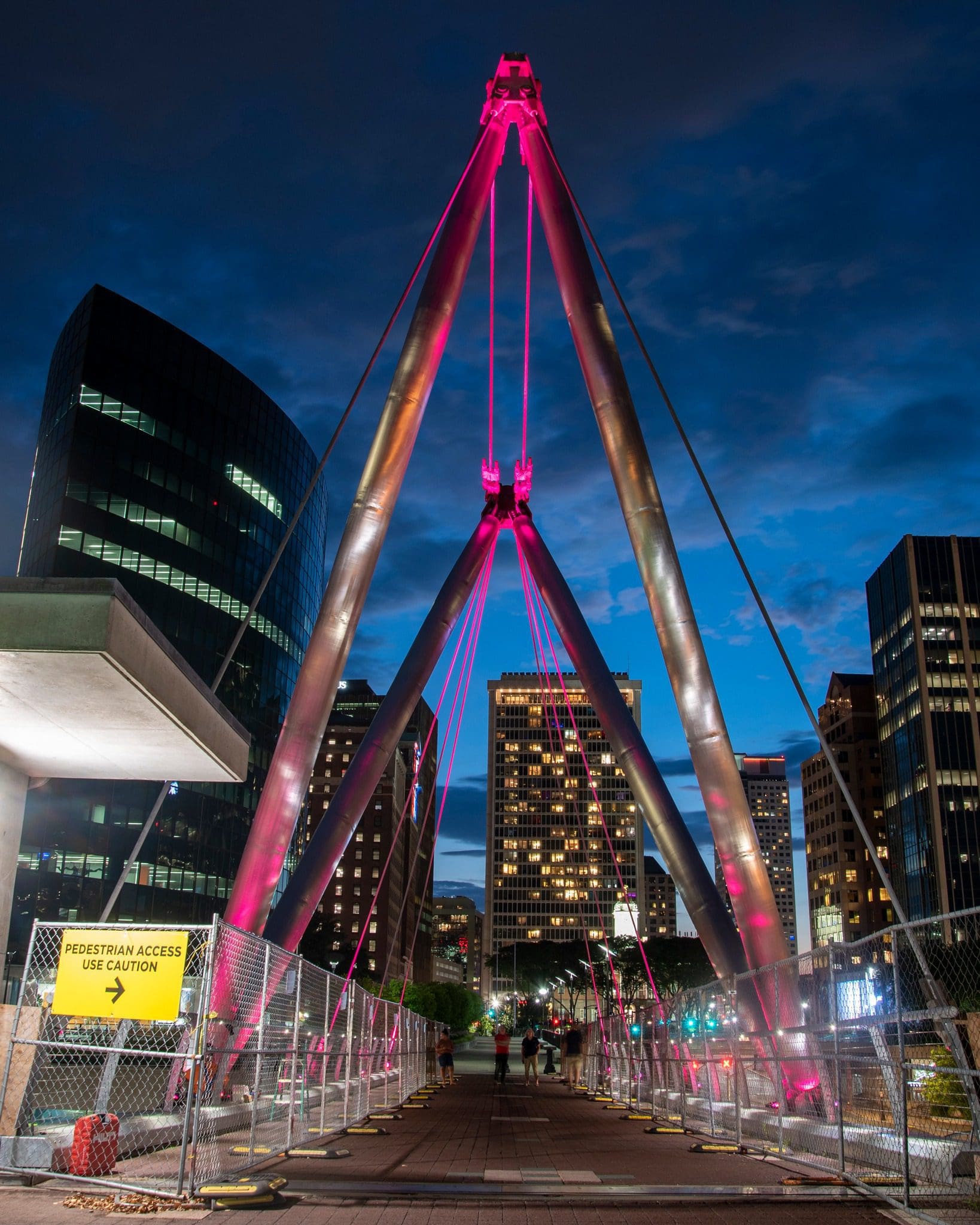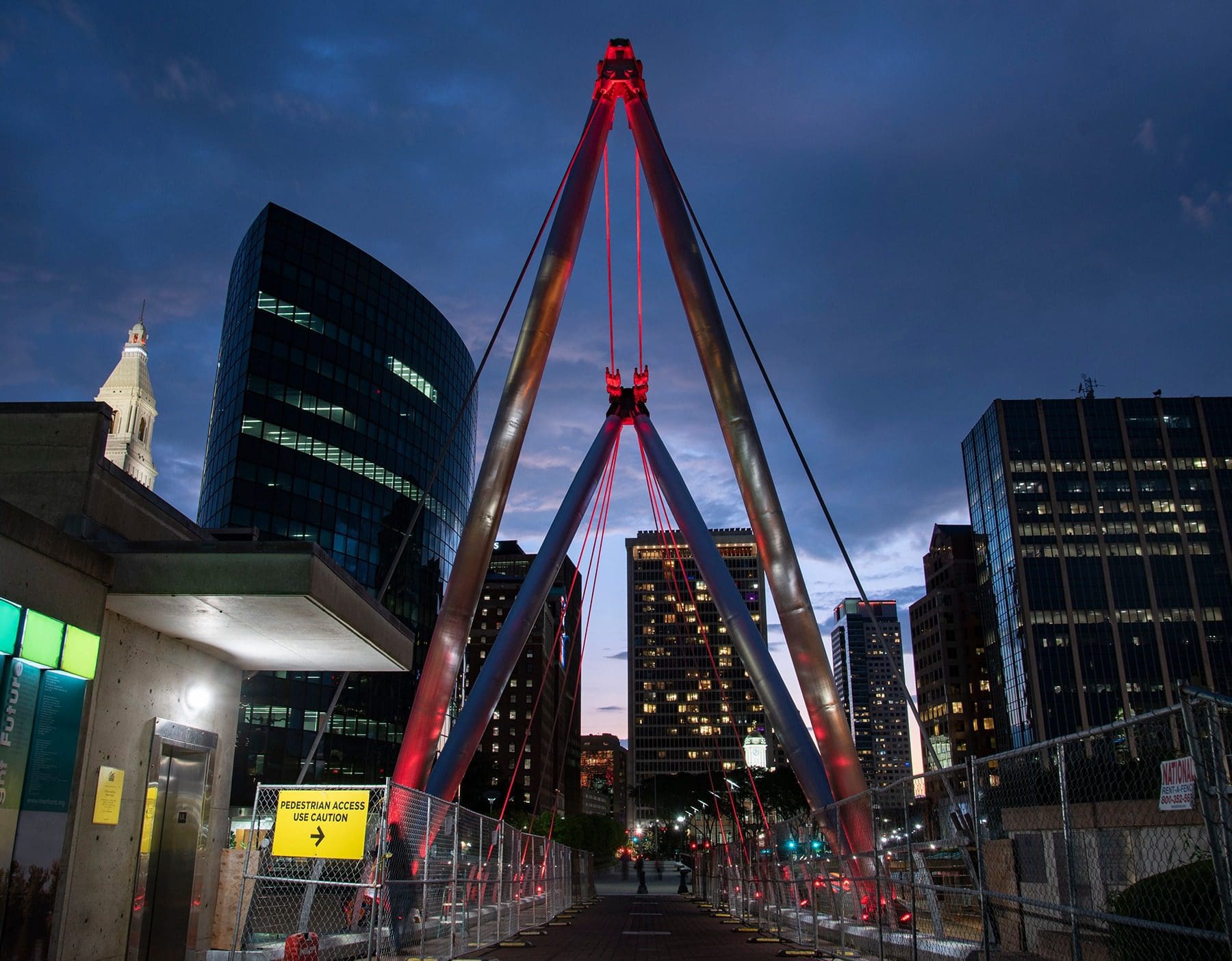 We lit the new LED lights on the Columbus Boulevard Bridge last night, and they’re not just pretty, they’re practical. The 16 Lumenpulse floodlights on the cables and masts and the 38 KLIK LED pod lights on the railings consume only 12.9-kilowatt hours per day; the old lights consumed 123 kilowatt hours each day.