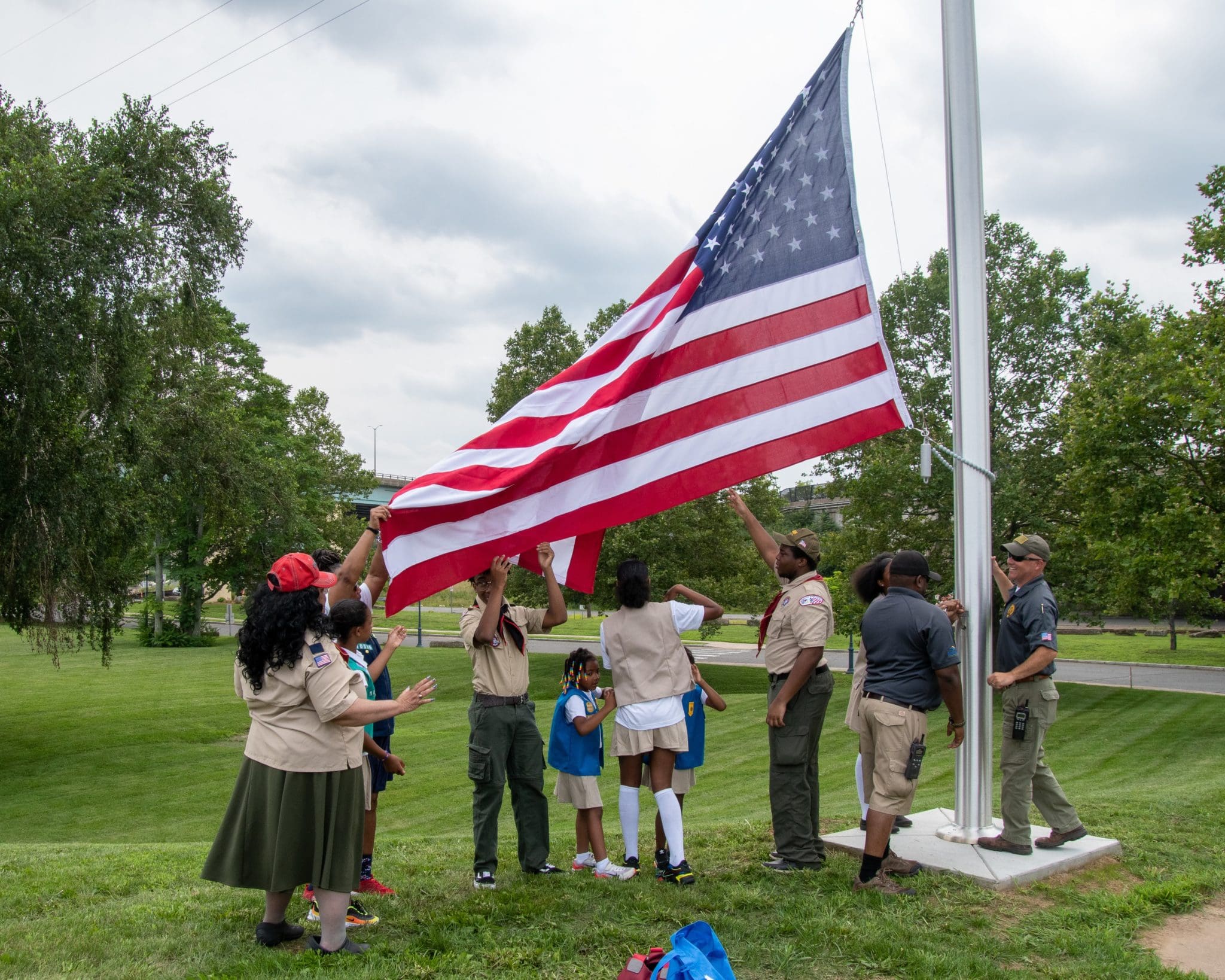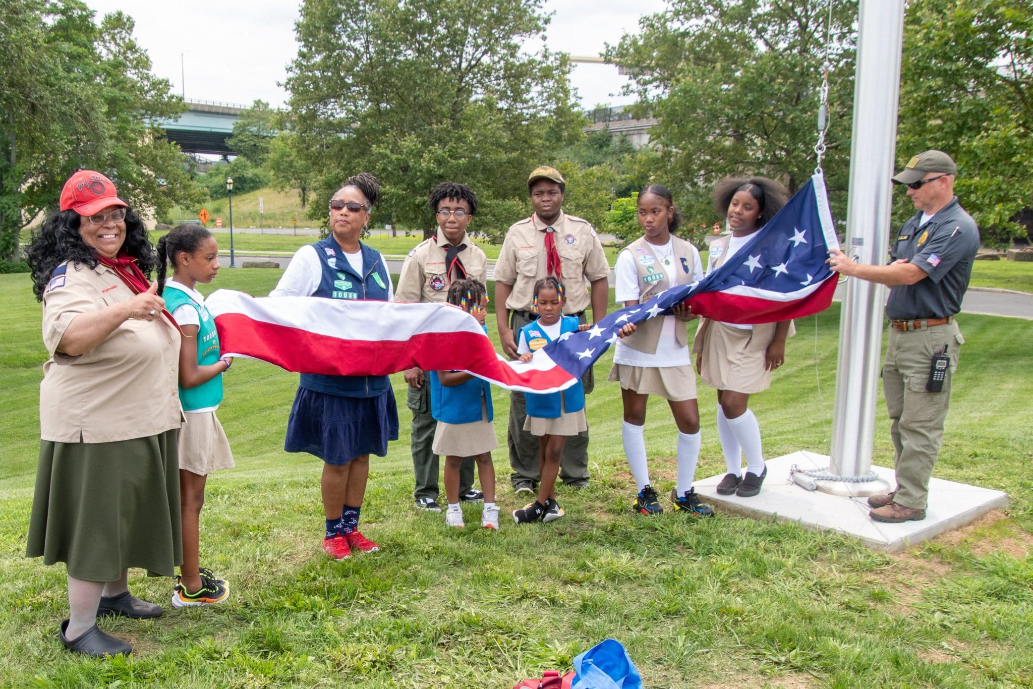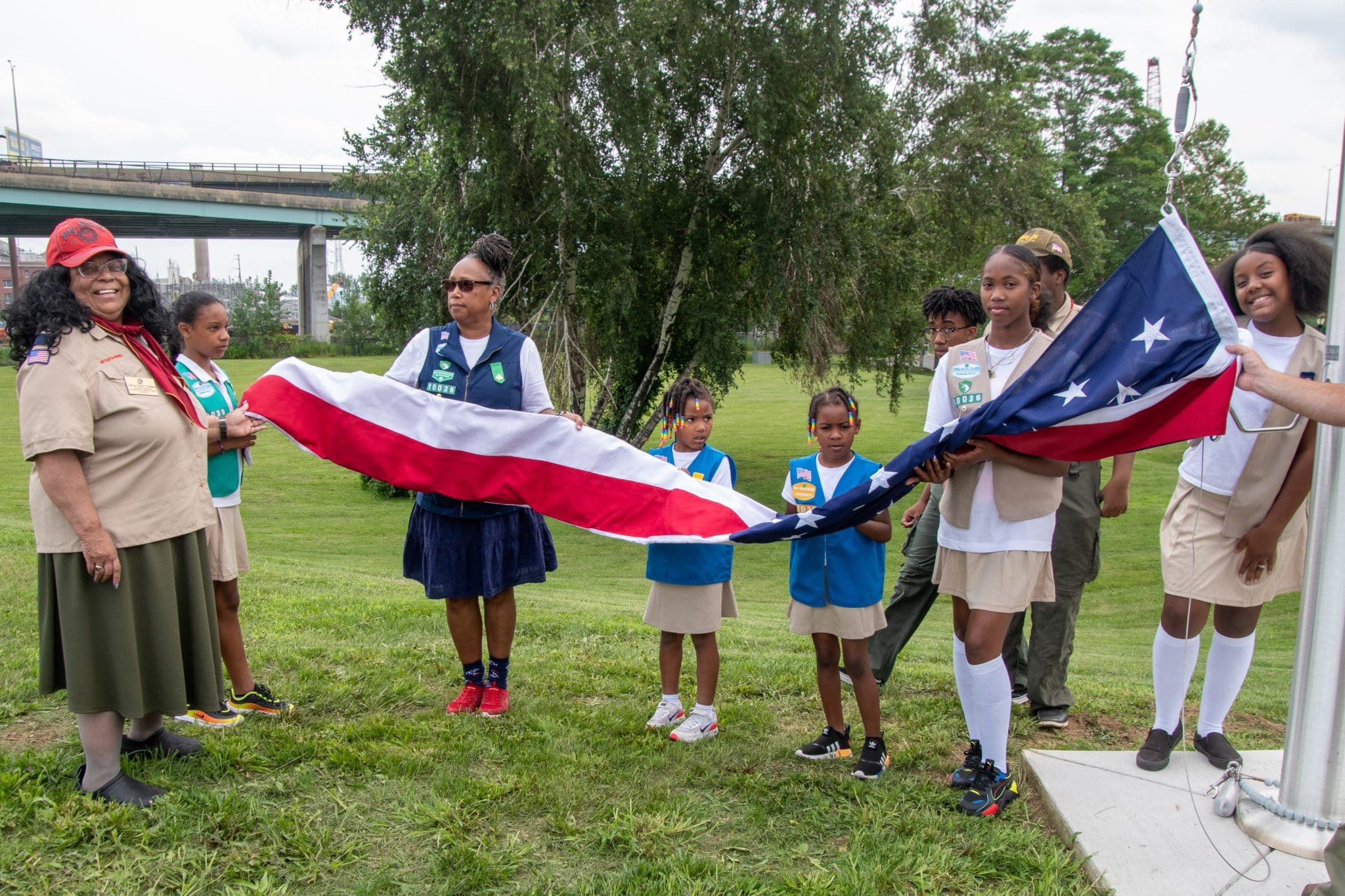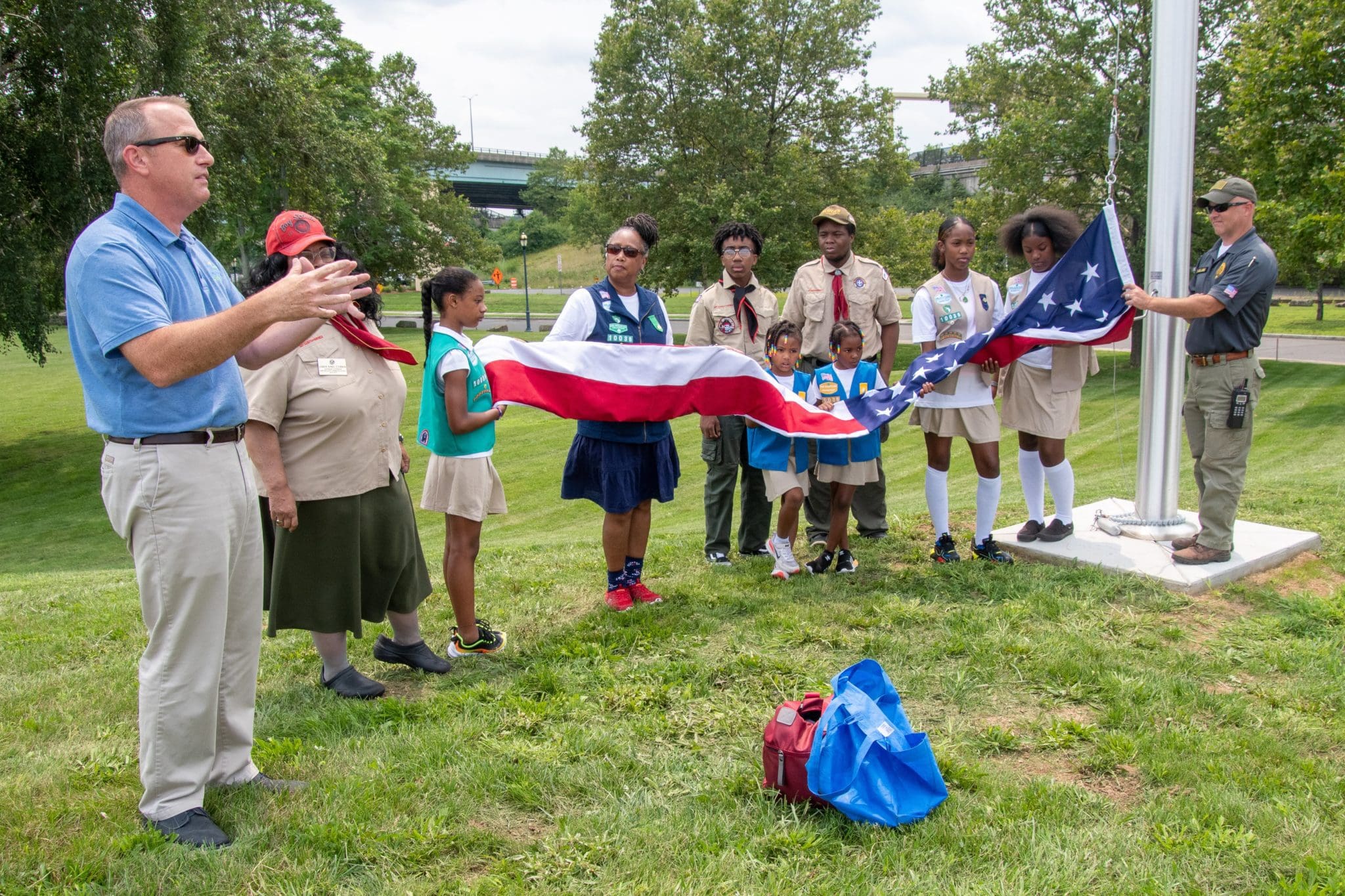 Hartford Scouts Raise Flag in Charter Oak Landing Members of Hartford’s Girl Scouts Troop 10036 and Boy Scouts Troop 2 worked together to raise the flag on our newly installed flagpole in Charter Oak Landing. t was such a pleasure to meet them, and we hope to see them in our parks again soon.