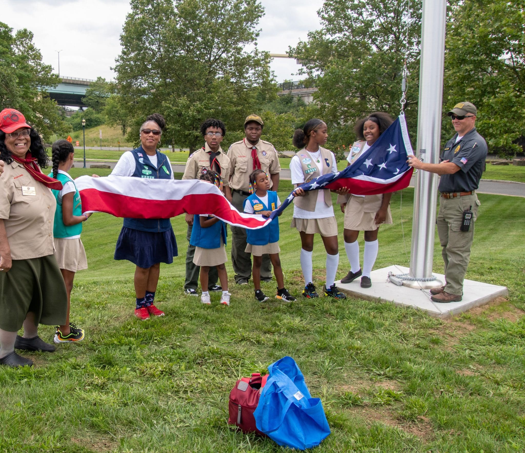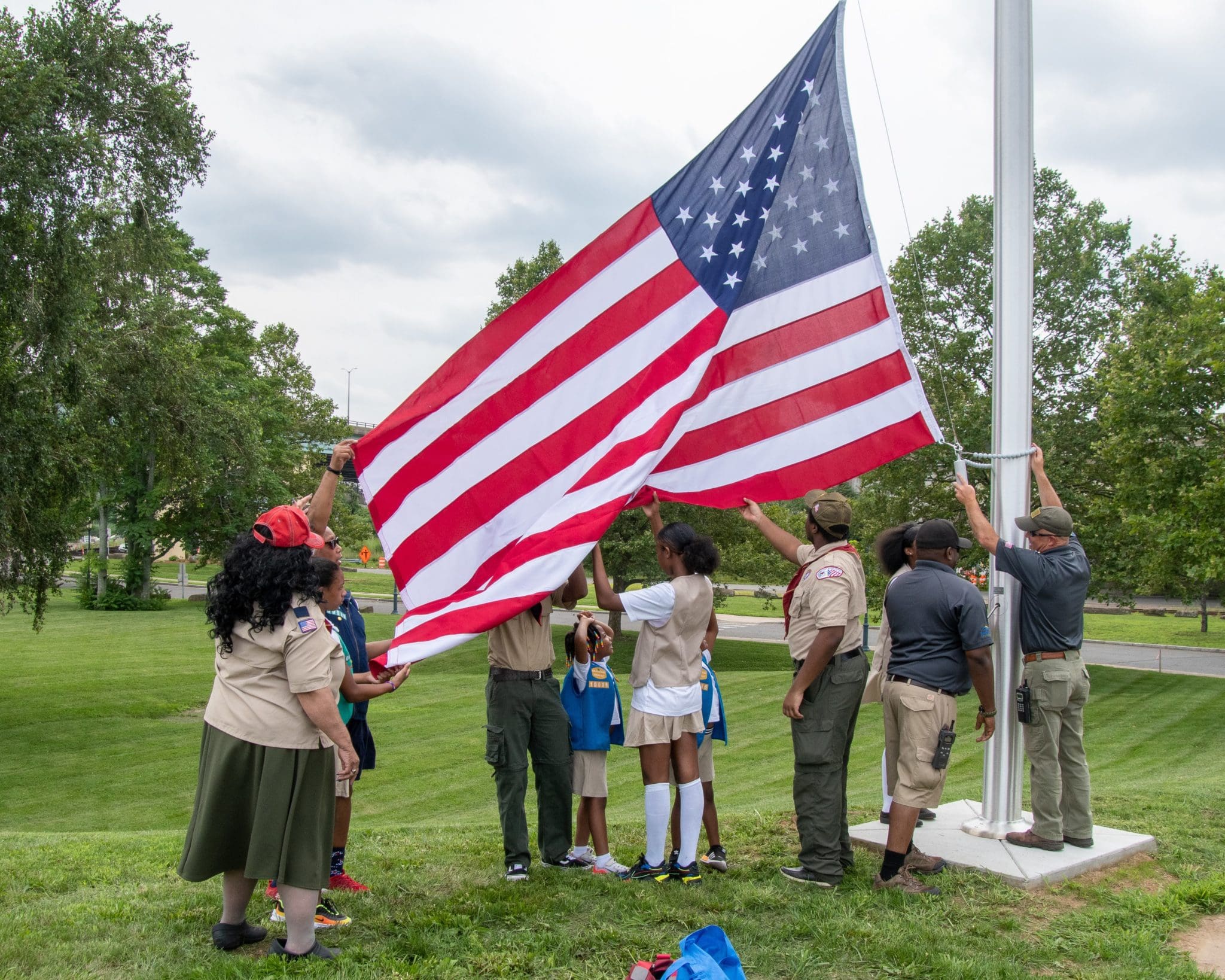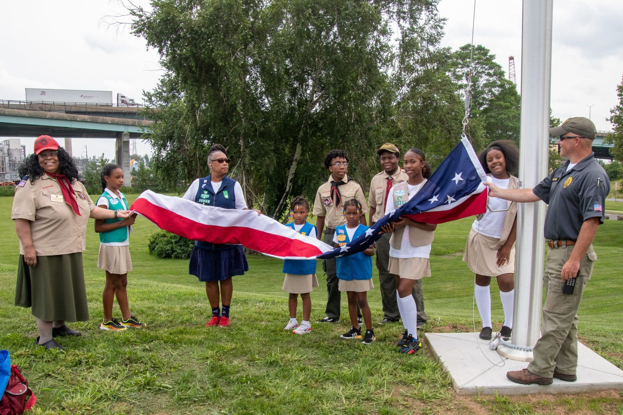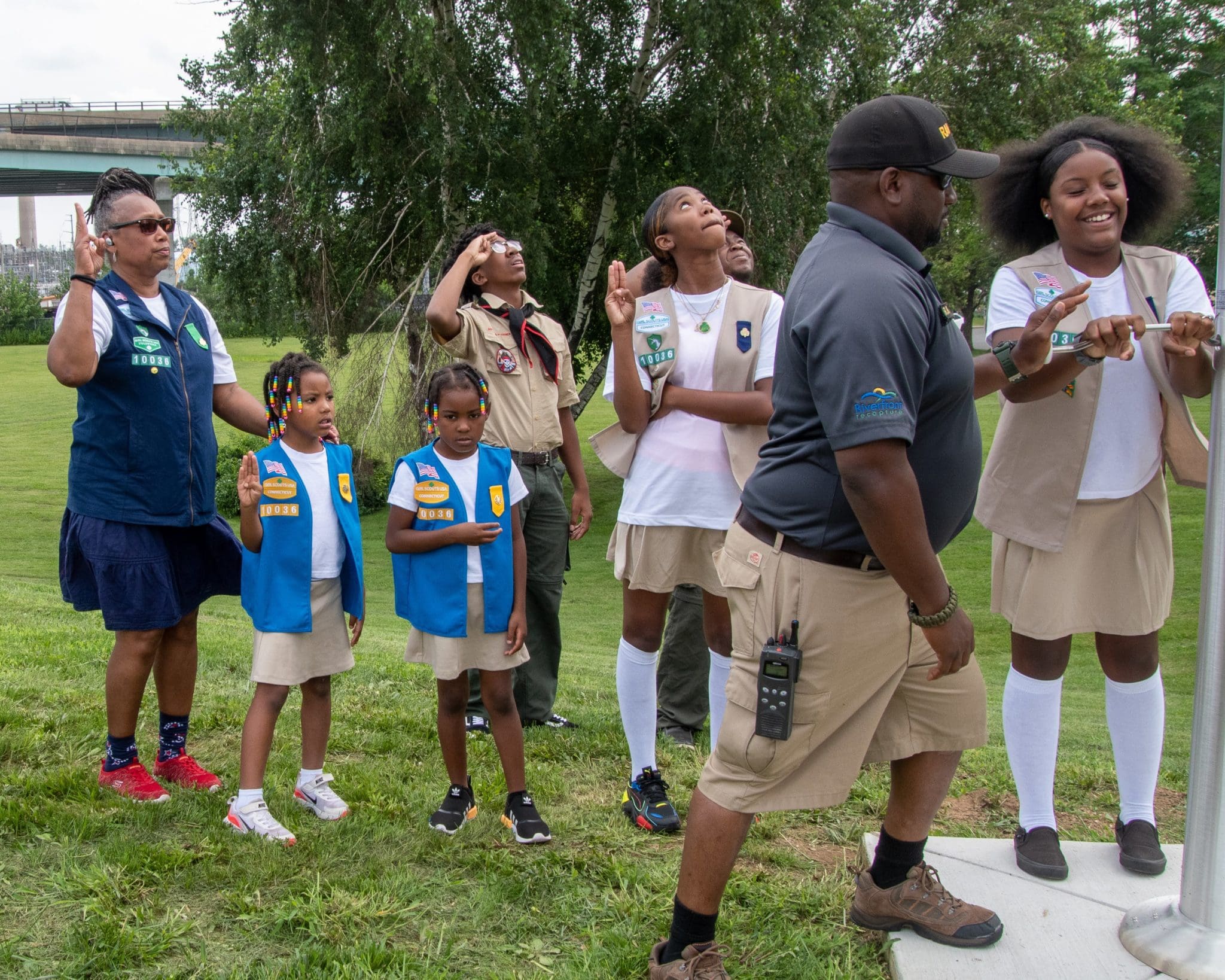 Hartford Scouts Raise Flag in Charter Oak Landing Members of Hartford’s Girl Scouts Troop 10036 and Boy Scouts Troop 2 worked together to raise the flag on our newly installed flagpole in Charter Oak Landing. t was such a pleasure to meet them, and we hope to see them in our parks again soon.
