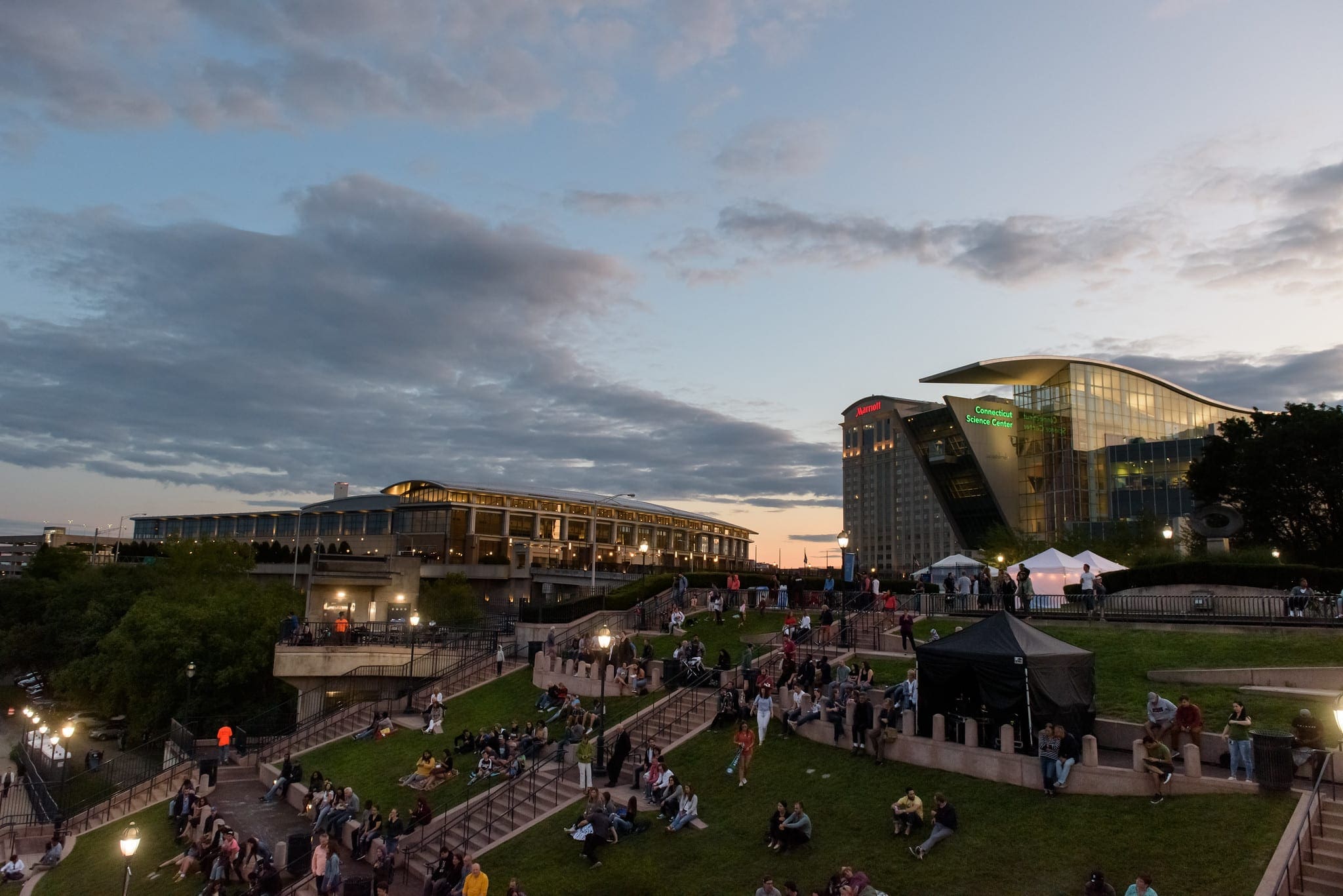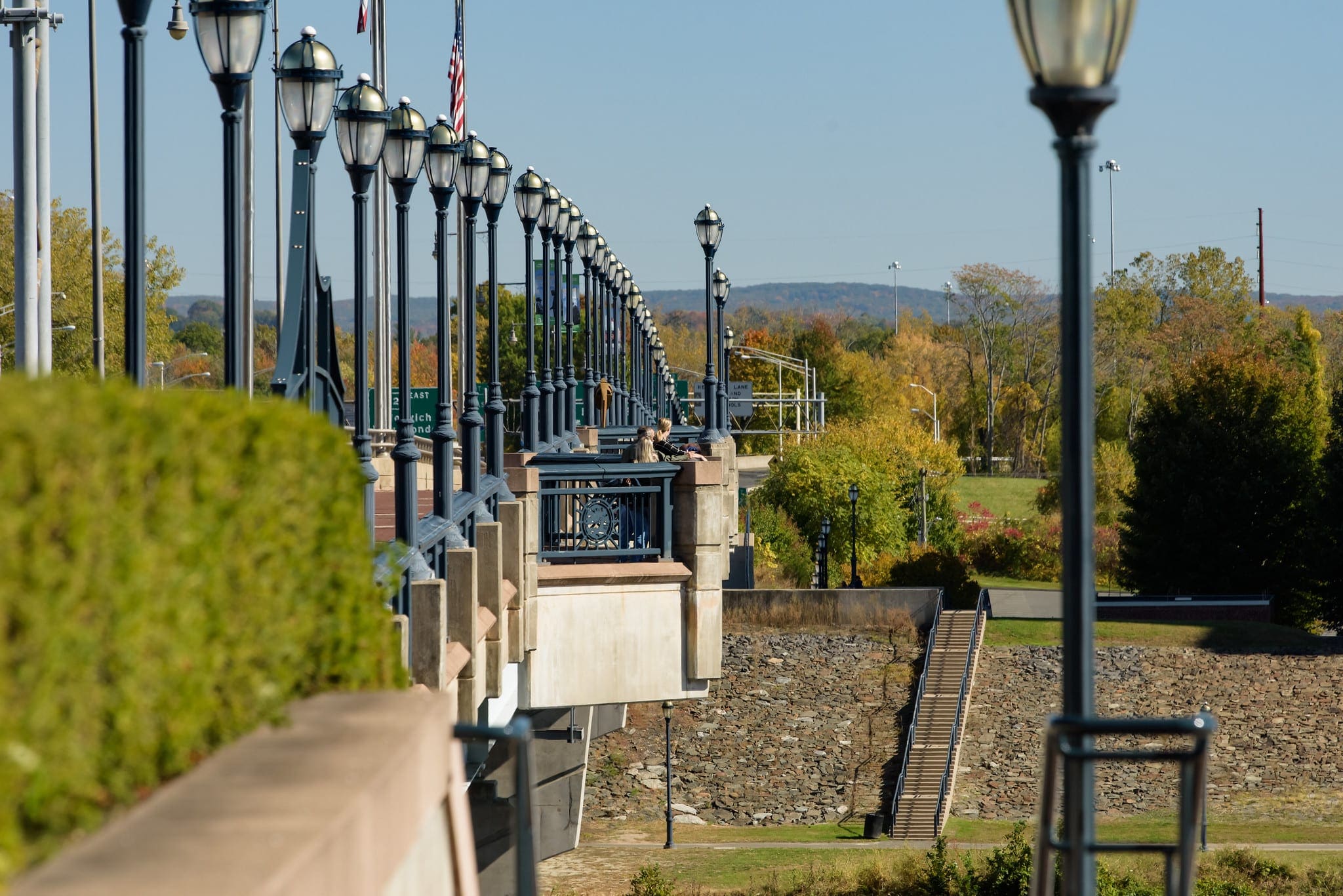 Mortensen Riverfront Plaza is the centerpiece of the Riverfront Recapture park system with a stage at the river’s edge and seating for 2,500 people on a grassy terrace. The Founders Bridge promenade connects Hartford with East Hartford, linking directly to Great River Park.