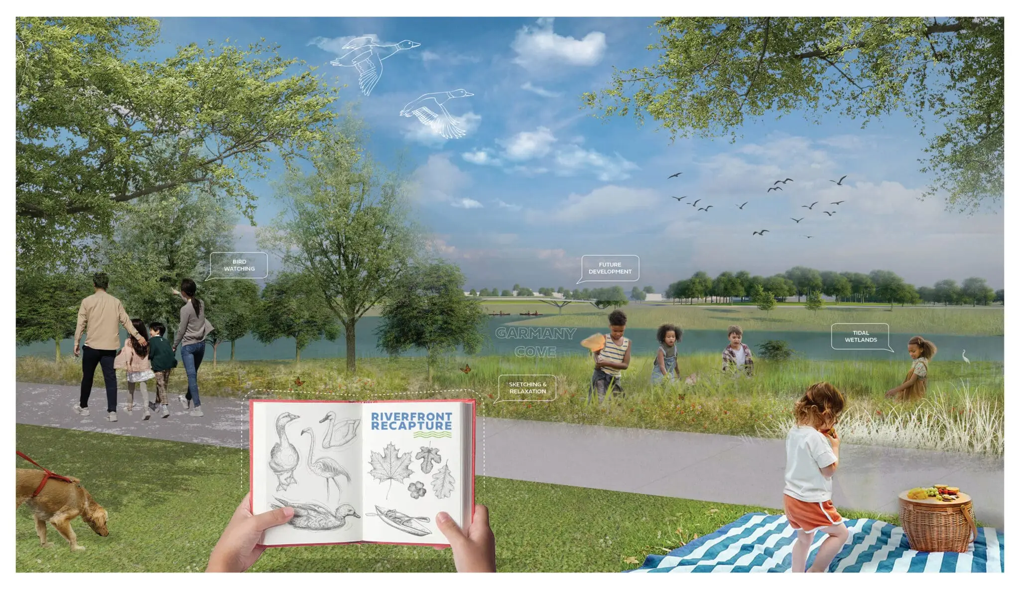 The emerging vision plan showcases programmatic areas of the future park that provide space for play, relaxation, events, and access to the river. Additional plan elements include community plazas, boat docks, fishing piers, playgrounds, picnic areas, and distinct yet interconnected ecological zones that foster biodiversity, provide environmental education, and promote ecological restoration, as well as Garmany Cove, which serves as both a recreational hub and vital habitat preservation zone, and the Joe Marfuggi Riverwalk, facilitating regional connectivity from South Windsor to Hartford and East Hartford.